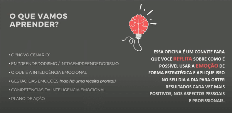 De acordo com a palestrante, o objetivo da oficina é que o participante reflita sobre como é possível usar a emoção de forma estratégica, compreendendo como o reconhecimento dos sentimentos pode favorecer melhores resultados, revendo suas atitudes para aprimorar suas competências emocionais.