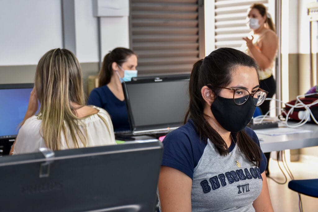 Desde 22 de março, o Centro de Monitoramento Domiciliar de Covid-19 está alocado em dois laboratórios de informática do Prédio A do Campus Mantiqueira da Unifeob. O setor do Departamento de Saúde de São João da Boa Vista acaba de receber um grande reforço para a demanda crescente de trabalho: 50 voluntários do último ano do curso de Enfermagem. Eles estão divididos em turnos de quatro horas e começaram o serviço em 31 de março.