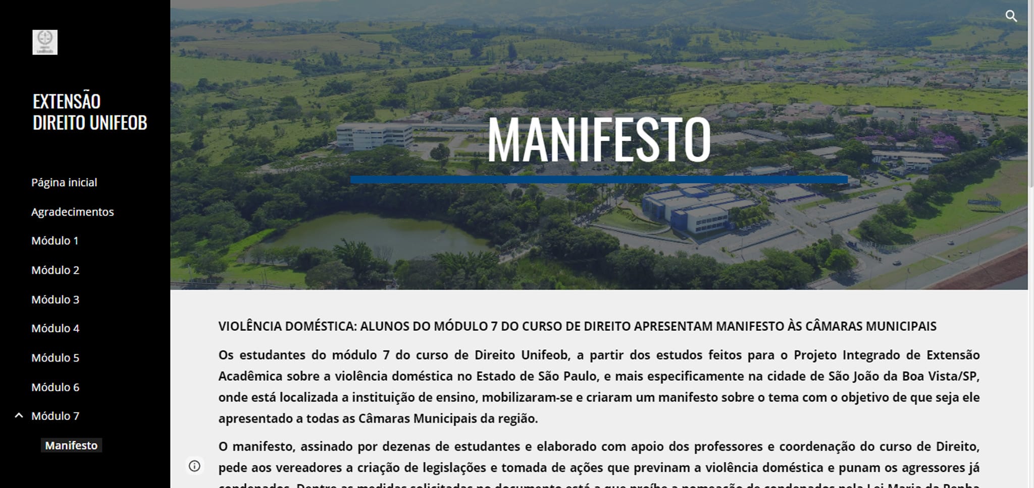 Futuros juristas devem estar atentos às leis para encontrarem oportunidades de aprimoramento. Os estudantes do módulo 7, além dos projetos de extensão, fizeram um manifesto a Câmaras Municipais de vários municípios da região de São João da Boa Vista sobre o tema de violência doméstica, trabalhado ao longo do semestre.
