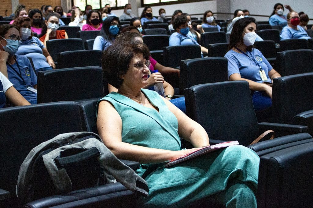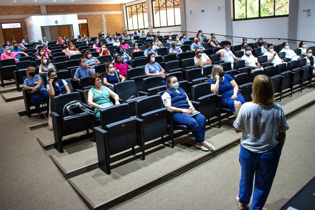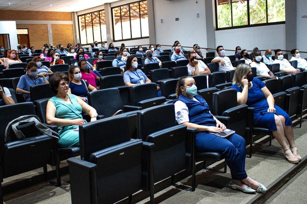 O evento aconteceu no Teatro Profª Lucila Martarello Astolpho, na Cidade das Artes, e contou com a presença da coordenadora do curso de Enfermagem, Me. Eliane Mendes; da coordenadora do Ambulatório Médico de Especialidades (AME) de São João da Boa Vista, Dra. Gisela Ramalho Safady; e da professora Eluana Maria Cristofaro Reis.