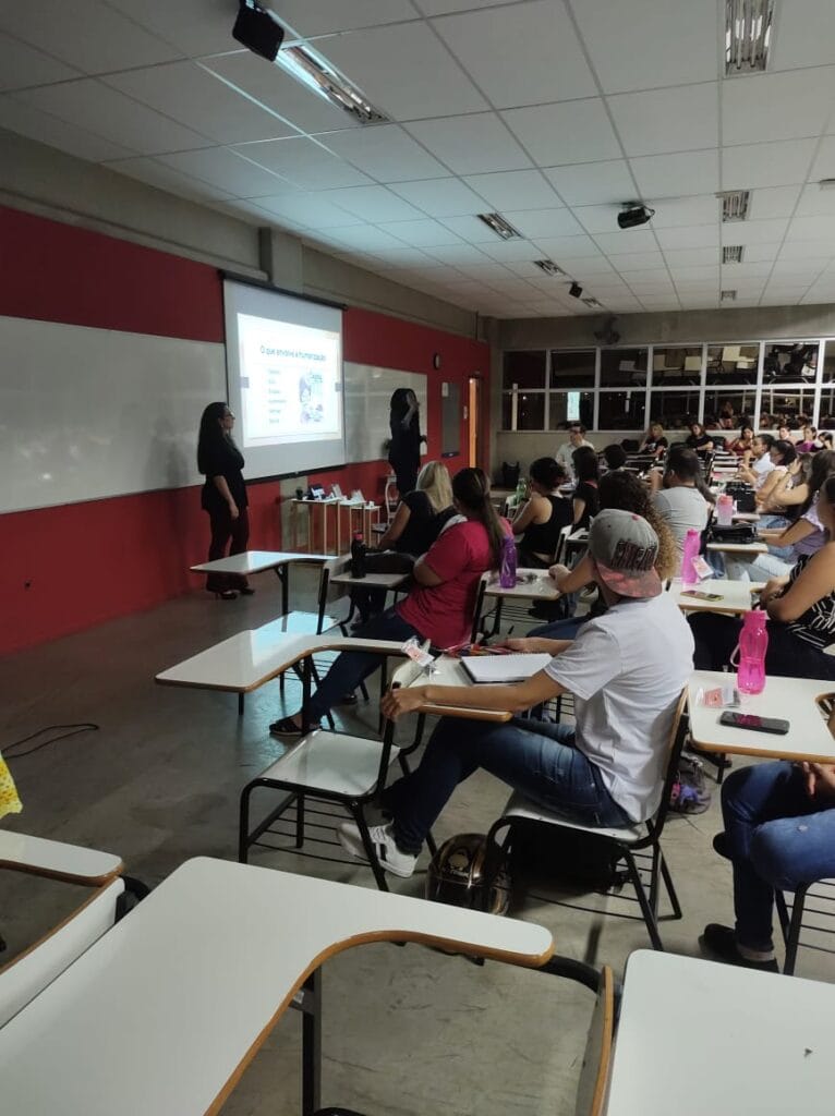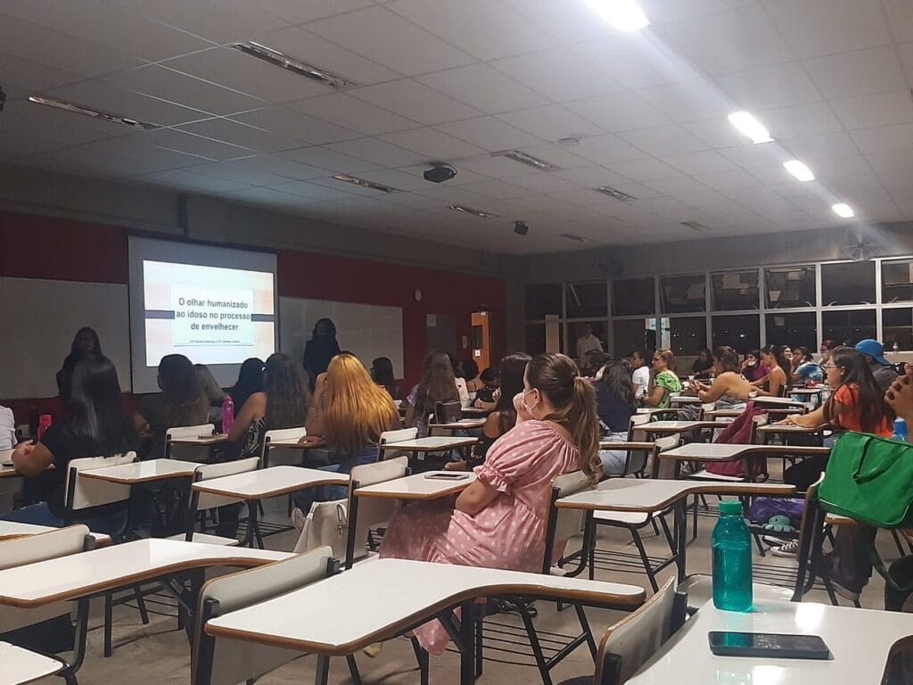Estudantes da graduação e técnico em enfermagem prestigiaram uma palestra das enfermeiras Mariana Madruga e Vanessa Tavares, ambas formadas na Unifeob. O tema era “O olhar humanizado ao idoso no processo de envelhecer”.