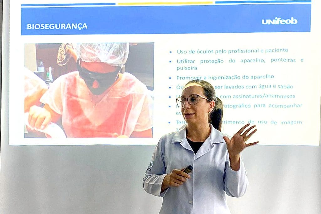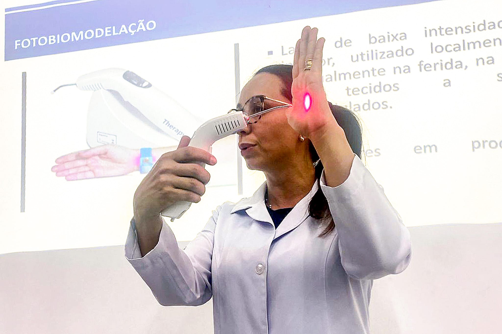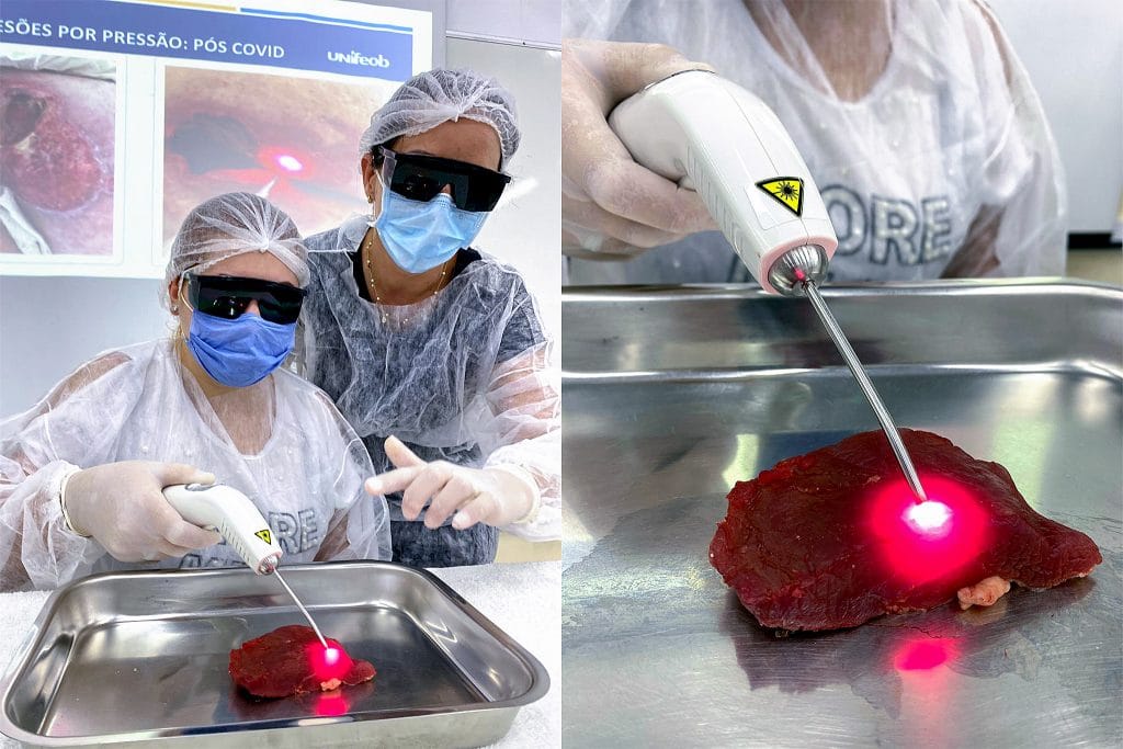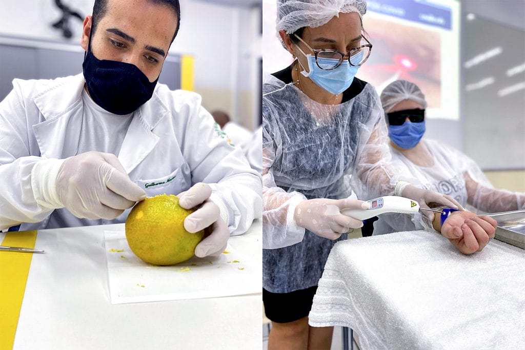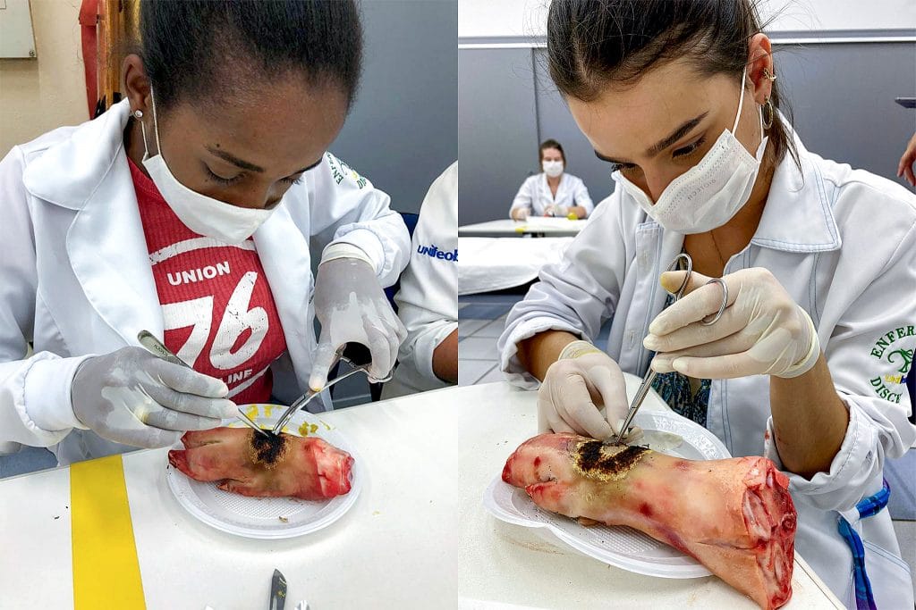 O Laboratório de Enfermagem do Campus Mantiqueira foi sede de uma aula especial para 49 estudantes do 2º módulo do curso na última segunda (20): laserterapia, oxigenoterapia hiperbárica e desbridamento instrumental conservador em pata de animais mortos e laranjas. As técnicas são uma inovação tecnológica no tratamento de lesões e preparam ainda mais os universitários para atuar em instituições de saúde com um trabalho de excelência.