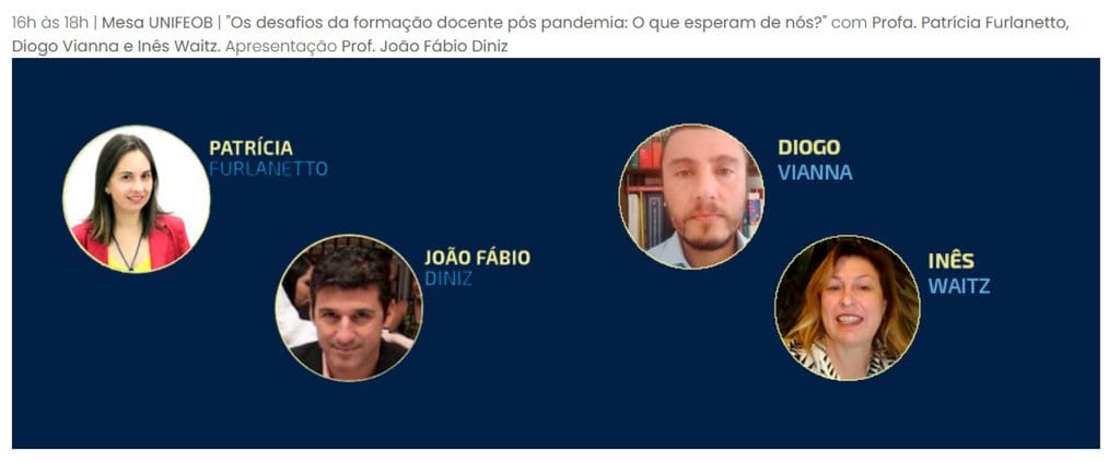 A Unifeob participará do Congresso Nacional de Educação com a presença dos professores Diogo Vianna, João Fábio Diniz, Patrícia Furlanetto e Inês Waitz. O encontro acontecerá no dia 10 de junho, das 16h às 18h, com o tema: “Os desafios da formação docente pós-pandemia: o que esperam de nós?” Para outras informações, acesse o site oficial do evento: educacaopocos.com.br.