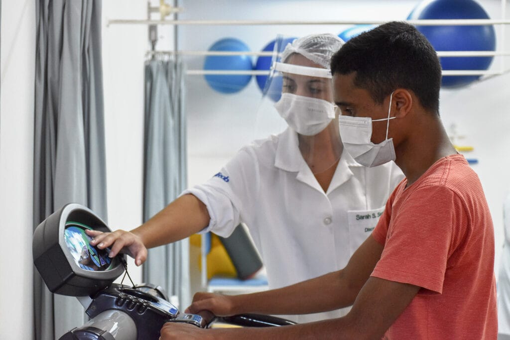 A Clínica de Fisioterapia da Unifeob tem atendido pacientes com sintomas persistentes de Covid-19 em sua estrutura montada na Santa Casa de Misericórdia, e remotamente no Campus Mantiqueira. “A ideia é fazer com que as pessoas passem por esse momento de uma forma mais tranquila, com orientações e que seja um processo menos sofrido”, explica a professora Maria Imaculada Silva, mais conhecida como Imá. “Como profissionais de Saúde, temos nosso papel a cumprir diante dessa pandemia”.