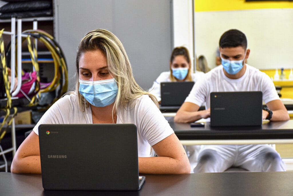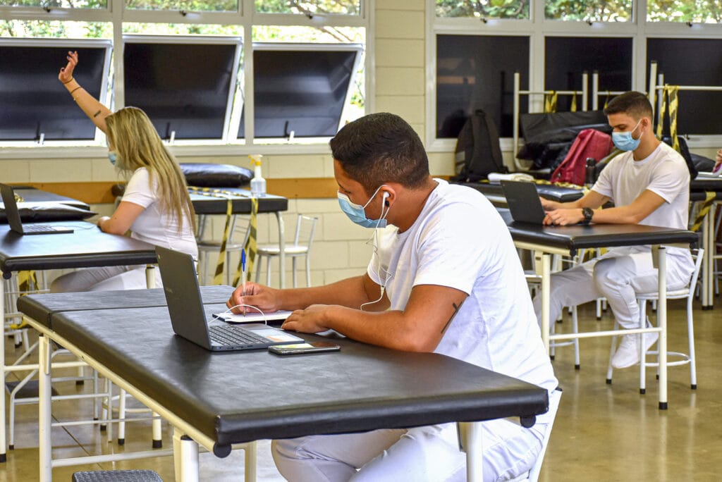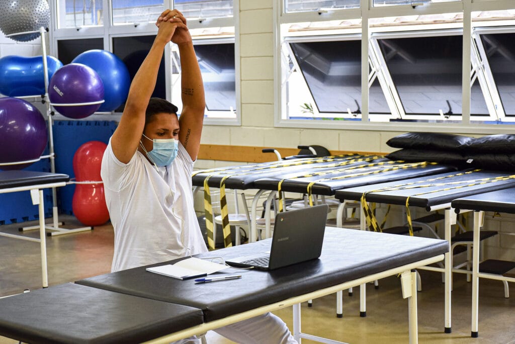 Implantado há três semanas para atender a pacientes pós-Covid com sintomas leves, o atendimento remoto é feito duas vezes por semana: às terças-feiras, à tarde, e às quintas, de manhã. A atividade começou por conta de uma demanda interna, mas rapidamente se expandiu. A prática conhecida como telessaúde é autorizada pelo Ministério da Saúde e realizada por estudantes constantemente monitorados por professores de Fisioterapia.