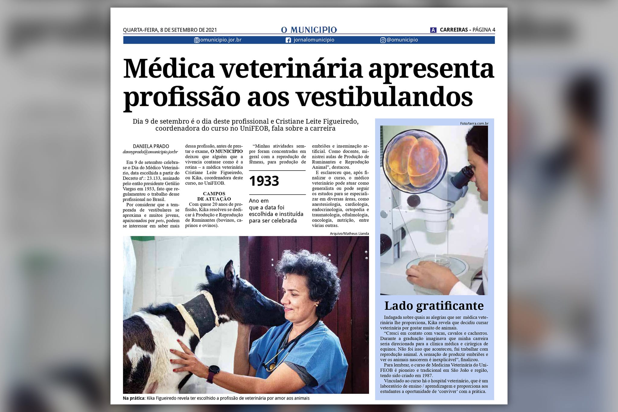 Em comemoração ao Dia do Médico Veterinário, celebrado em 9 de setembro, o jornal O Município prestou uma grande homenagem aos profissionais da área com uma entrevista com a coordenadora do curso de Medicina Veterinária da Unifeob, Cristiane “Kika” Figueiredo. Escrito pela jornalista Daniela Prado, o conteúdo foi o destaque da edição desta quarta-feira (8).