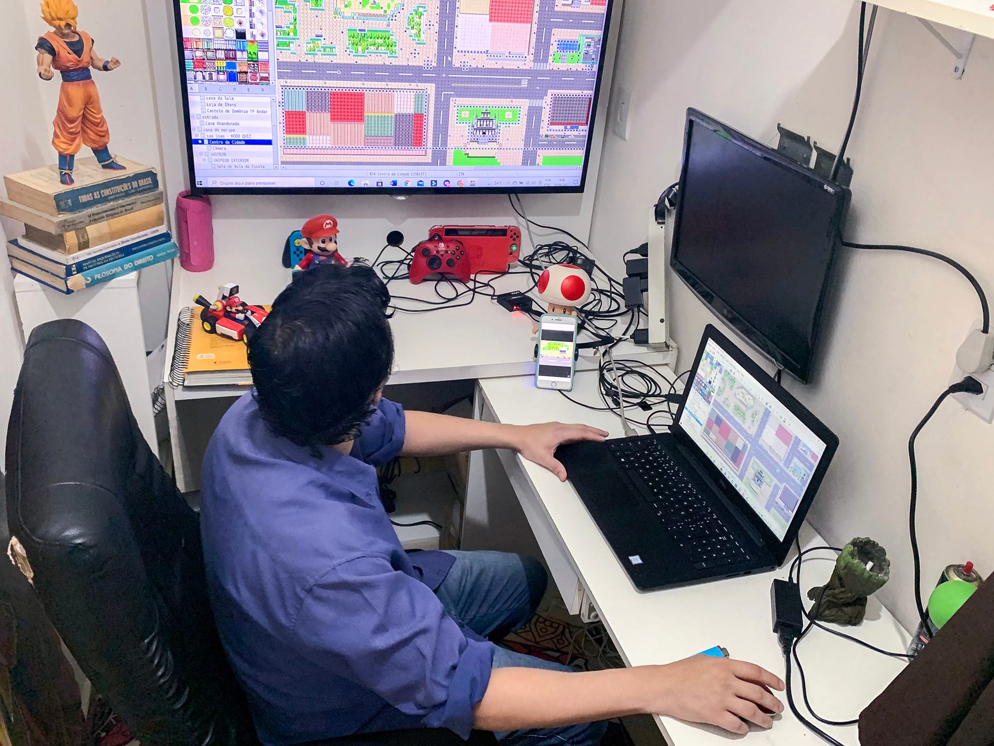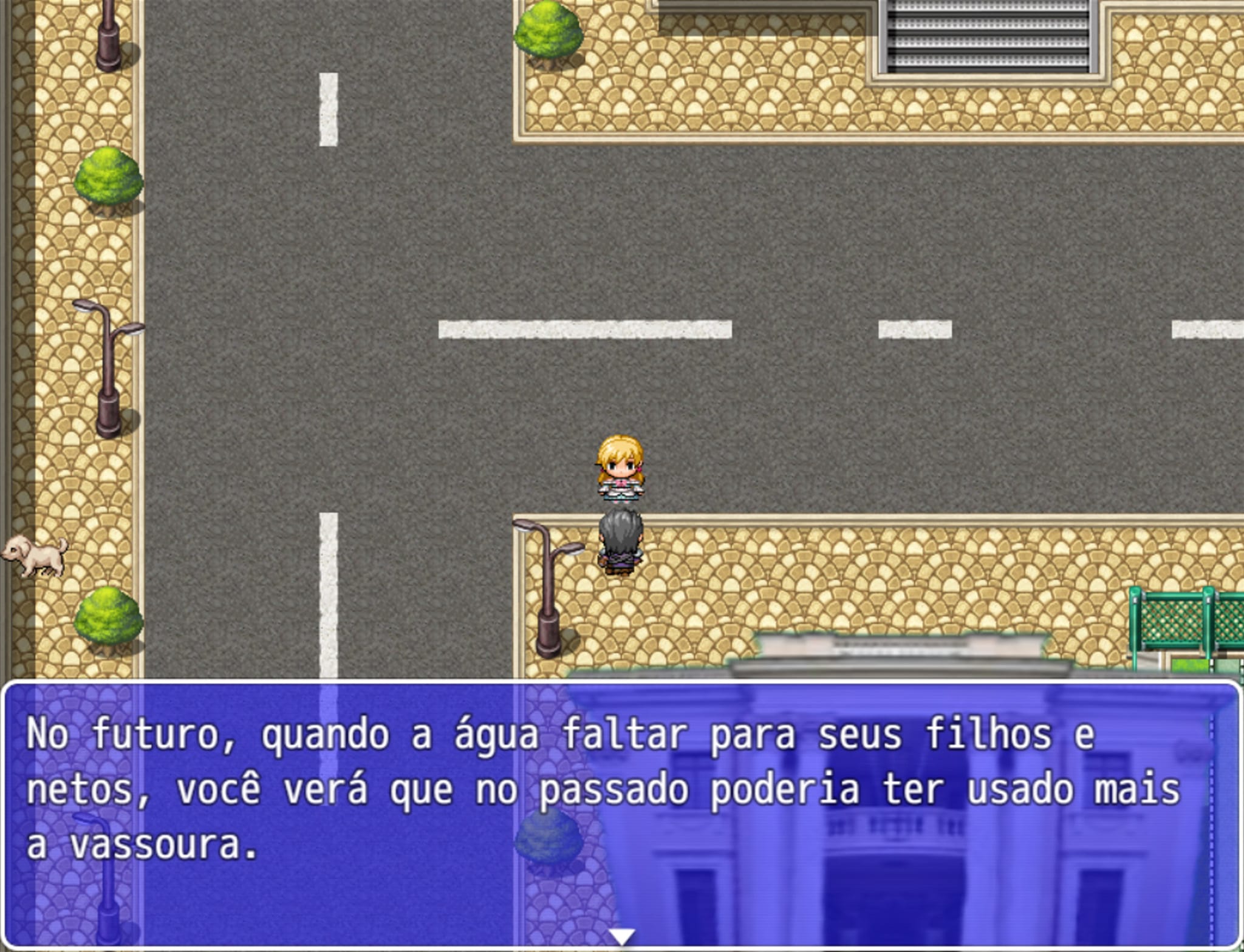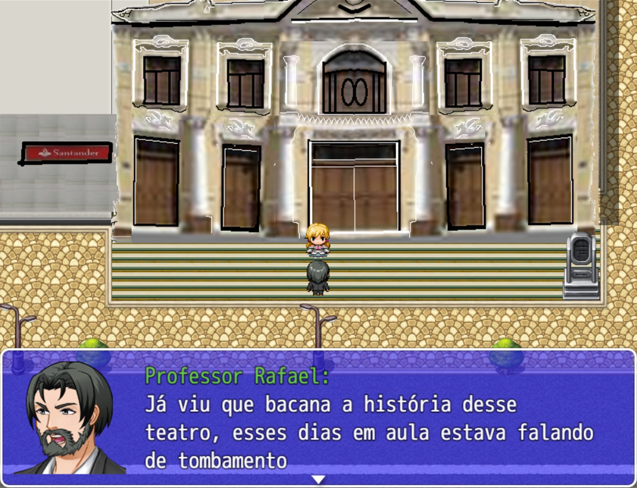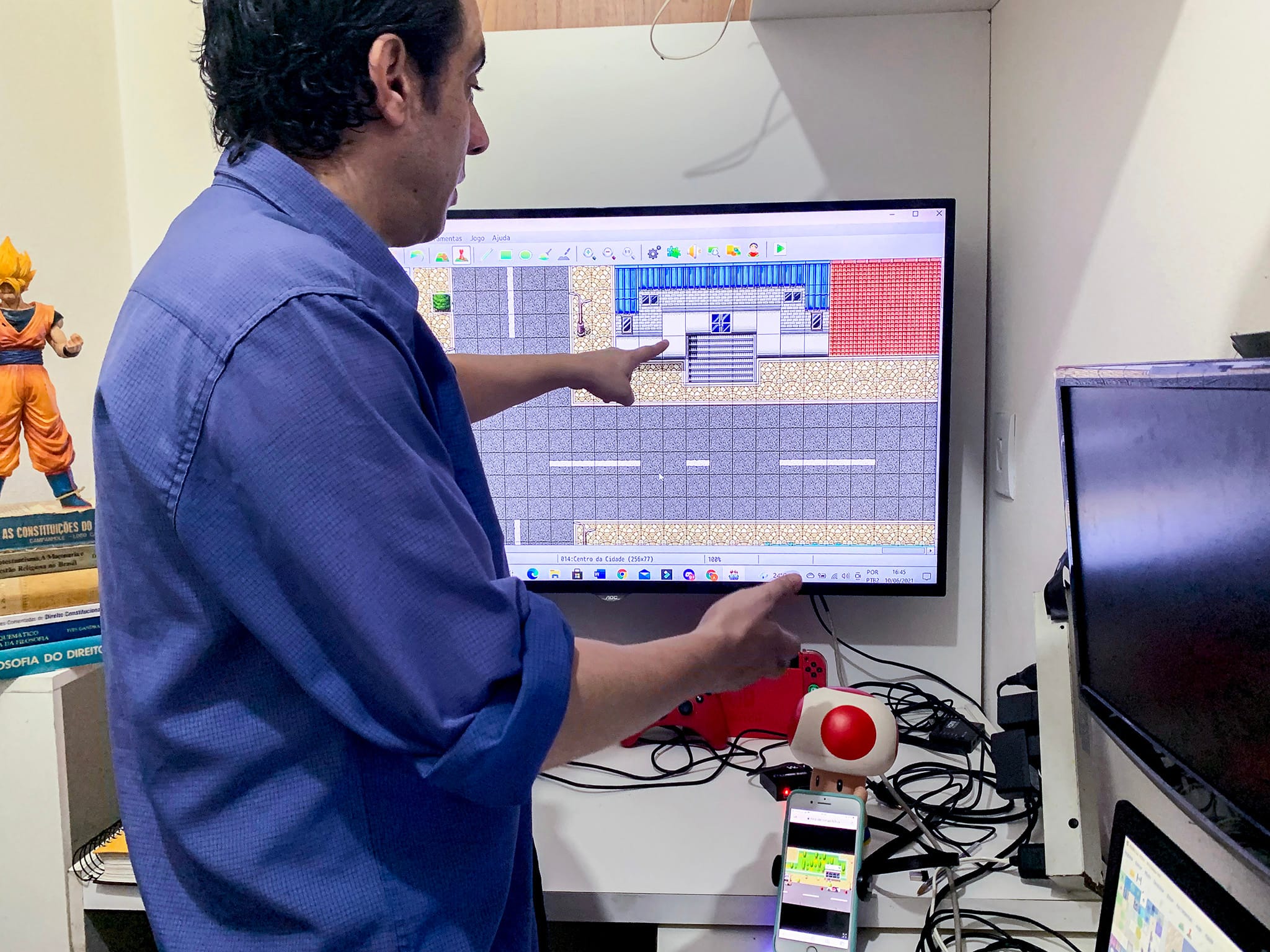 “Tivemos a ideia de alcançar esse objetivo de um jeito diferente. Por uma autonomia criativa ofertada pela universidade somada às qualidades estéticas de São João, percebemos a possibilidade de um mapa interativo. A engine do RPG Maker [plataforma usada para desenvolver o game] caiu como uma luva ”, relembra Antônio. “Partimos de uma arte conceitual de uma planta baixa do centro nutrida de texturas em pixel art. Usamos linhas de programação e plugins alternativos para auxiliar o software. O conteúdo foi elaborado a partir de pesquisas científicas nas áreas de Direito Ambiental, Internacional, Administrativo e Previdenciário escoradas em estudos sociológicos e filosóficos, abordando também a historicidade local”.