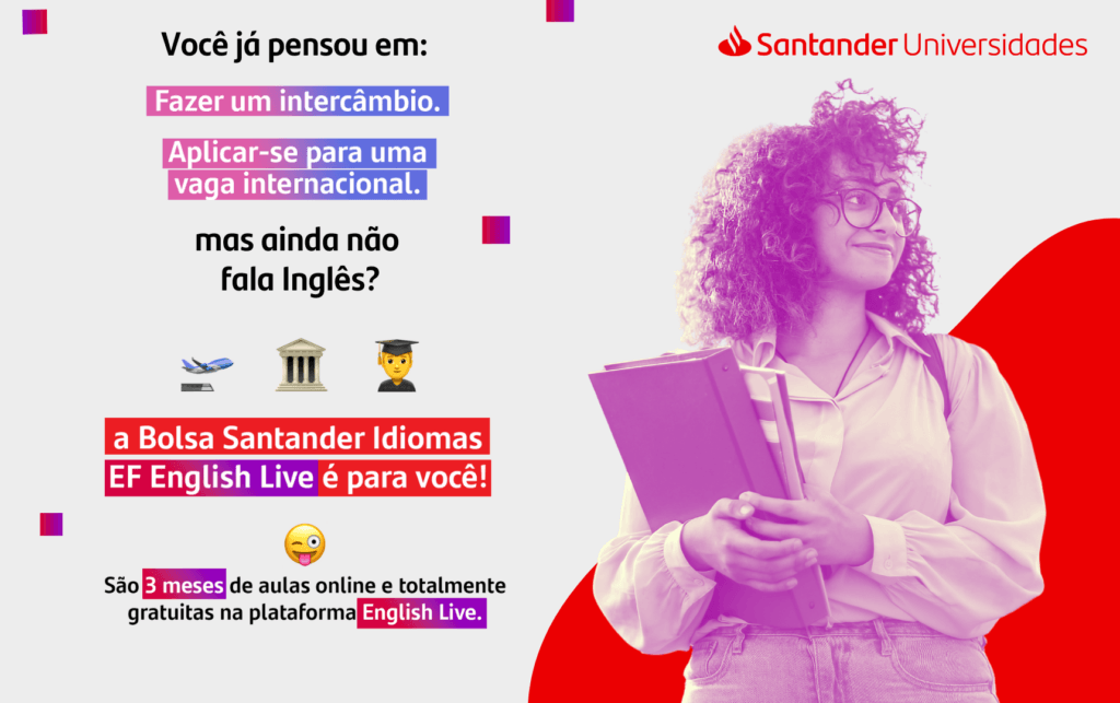 Já o Santander EF English Live é uma parceria com a maior escola de Inglês online do mundo, a EF English Live. São acessos de 90 dias gratuitos a todos os conteúdos e níveis de ensino da plataforma e após este período, os bolsistas Santander terão descontos especiais.