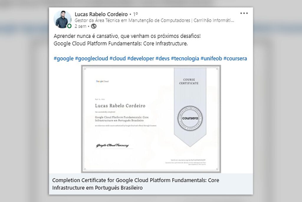 Trata-se de uma série de cinco cursos com 40 horas de conteúdo. “Os estudantes começam a entender o funcionamento e a infraestrutura da nuvem”, explica Marudi. “Eles ganham as aulas, que geralmente seriam pagas, para se capacitar e têm acompanhamento da equipe do Google, de docentes da Unifeob e todo o apoio da coordenação para fazer as provas de certificação, que também são ofertadas gratuitamente”.