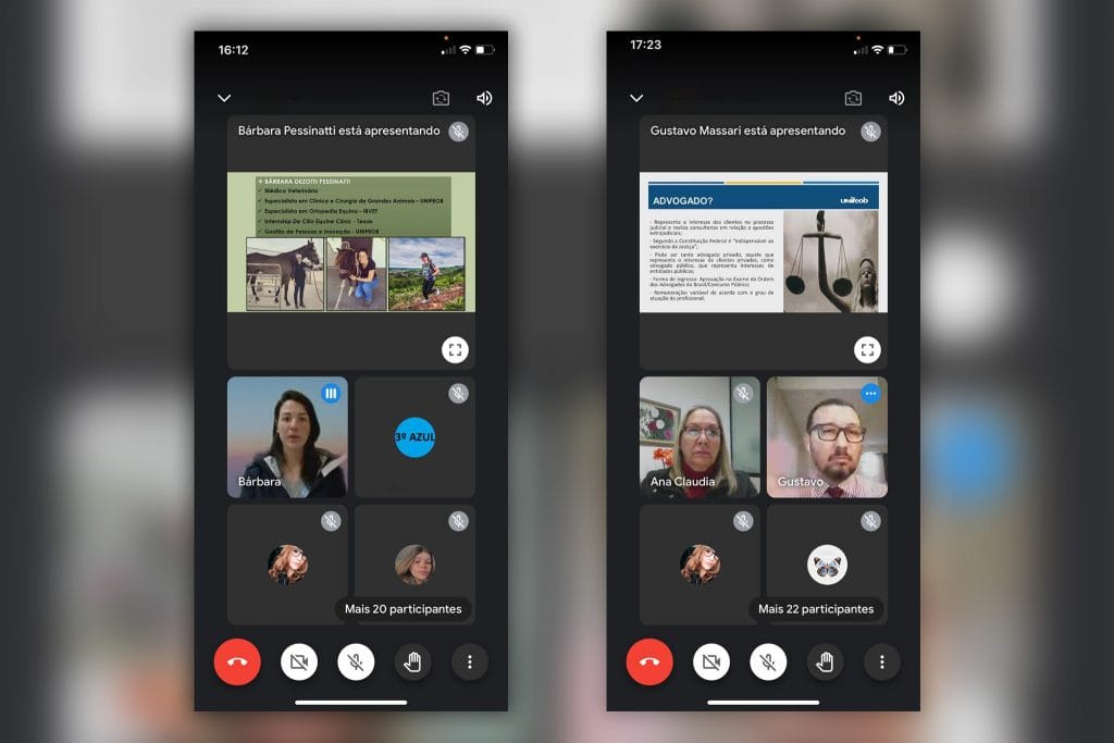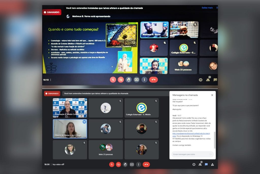 Organizados pelo setor de Relacionamento com Escolas, quatro encontros foram realizados remotamente pelo Google Meet de 28 de junho a 1º de julho: Nutrição, com a coordenadora Gláucia Ruga; Psicologia, com o Prof. Matheus Verne; Direito, com o Prof. Gustavo Massari; e Medicina Veterinária, com a Prof. Bárbara Pessinatti.